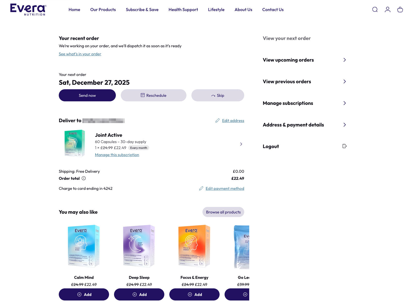 Take full control of your subscriptions from the ‘Subscriptions’ link in your account. You can skip your next order or change the date of your next order at any time.